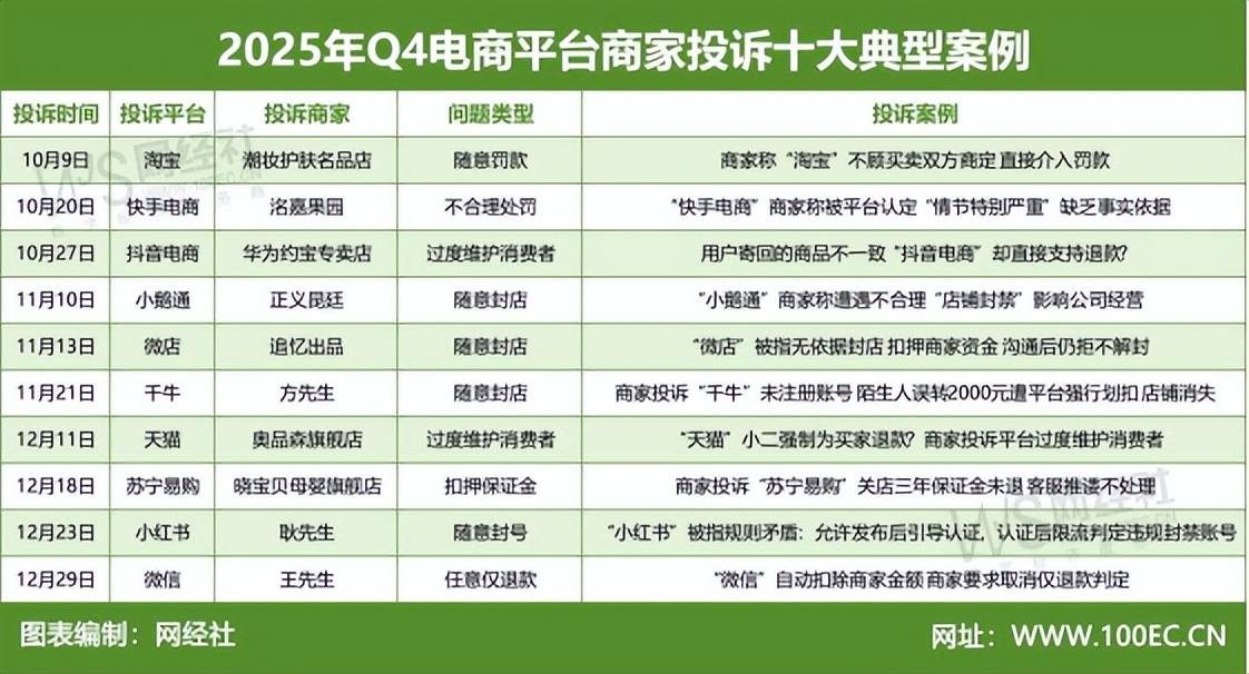 1月7日,根据收集消费胶葛调整平台“电诉宝”商家赞扬通道Q4受理的全国电商平台大量商家赞扬案例,网经社电子商务研究核心例行发布《2025年Q4电商平家赞扬数据演讲》。演讲涉及了分析电商、曲播电商、电商办事商等范畴,并发布了四时度电商平家赞扬数据及十大典型案例,通过这些赞扬案例可窥见当前电商平家窘境。此中,抖音电商平台正在第四时度期间收到的298份商家赞扬,以下为抖音电商平家赞扬数据阐发以及典型商家赞扬案例。据“电诉宝”显示,四时度抖音电商平台涉及的298份商家赞扬,问题类型次要集中正在这五项,此中肆意仅退款占比最高,为46。64%;其余问题类型顺次为:过度消费者(29。53%)、肆意罚款(7。72%)、随便封店(1。34%)、金(1。01%)、强制运费险(0。34%)。四时度,赞扬抖音电商平台的商家注册地域TOP9顺次为浙江省(19。46%)、广东省(19。13%)、(15。77%)、河南省(6。38%)、江苏省(5。71%)、省(5。71%)、安徽省(3。36%)、云南省(3。02%)、陕西省(3。02%)。四时度,赞扬抖音电商平台的商家运营类目TOP5顺次为服拆服饰(23。49%)、户外用品(14。43%)、食物生鲜(7。72%)、个护洁净(6。38%)。10月27日,广东省的3C数码商家庄先生赞扬称,其于2025-10-17被抖音平台恶意仅退款订单款子359元,此订单消费者申请退货退款后寄回包裹,商家已于2025年10月12日收到用户寄回的包裹,经拆包核适用户寄回的商品取采办商品不符,同时间也有同步留言奉告消费者商家收到用户寄回的商品及拆包视频,消费者寄回的商品不分歧商家无法支撑退款,便订单售后申请。庄先生称,后续订单售后时商家也是有按平台要求同步上传拆包视频及收到包裹内的设备图片,但平台照旧正在未联系商家核实环境下自行为消费者订单退款。平台却以对付话术驳回了商家请求。庄先生暗示,现订单用户寄回的商品不符而且平台已为消费者订单退款,导致商家设备及订单款子均吃亏,庄先生要求平台返还订单款子359元。11月5日,浙江省的李先生向消费赞扬平台反映,其运营的服拆服饰类目店肆正在抖音电商平台任“肆意仅退款”的裁决。李先生称,买家于10月17日正在其店肆下单采办鞋子,其一般发货。买家收到货后申请退货退款,但其退回的商品已影响二次发卖。平台正在未经李先生同意的环境下,间接通过了买家的退货退款申请,导致其店肆发生资金丧失。李先生随后正在页面提交了相关凭证进行,但平台驳回了其的。李先生的是:平台从头审核,退还其运费及货款共计47。03元。对此,抖音平台的答复是:您好,经核实,平台已致电联系您奉告处置方案,订单6514 消费者反馈穿戴存正在非常问题,商家能够供给质检演讲,已发48小时短信收集材料,待上传;【超时未上传】,订单0915 消费者反馈商品非本单,支撑赔付【10。00】元,货款1-7个工做日内退还打款至商家聚合账户绑定的银行卡中。已提交赔付,感激您的反馈。11月19日,江西省的孙先生向消费赞扬平台反映,其运营的居家用品类目店肆正在抖音电商平台任“肆意仅退款”的裁决。孙先生称,买家正在收到商品后,因不领会操做方式而联系客服进行征询。然而,平台正在未进一步核实具体环境的前提下,间接将此次征询鉴定为商品存正在质量问题,并据此做出了向买家仅退款的处置决定。基于此,孙先生的是要求抖音平台从头审视并处置此笔订单胶葛,修订不合理的鉴定法则,并正在将来处置雷同售后申请时,采纳更审慎、客不雅的查询拜访流程,切实保障买卖两边的公允权益。截至发稿时,抖音平台的答复是:您好,经核查,平台核实消费者无效举证商品问题,支撑消费者无误,抱愧未取您告竣分歧,感激您的反馈取理解。11月19日,广东省的张先生向消费赞扬平台反映,其运营的户外用品类目店肆正在抖音电商平台任“肆意罚款”的裁决。张先生称,正在平台上架一款“华强北儿童手机”时,严酷遵照了系统提醒的保举类目进行选择,全程未收到任何干于“类目不符”或“需上传特定天分”的提示。商品一般发卖一段时间后,平台俄然鉴定其“类目错放”,并施以罚款、破产整理,最终做出清退店肆的处置。张先生对此提出多项质疑:其一,惩罚所根据的“错放”类目,恰是上架时平台本身所保举,商家认为此系“过后逃溯”,法则施行存正在矛盾;其二,该商品属需天分准入类目,但平台正在上架及后续运营中均未自动触发天分上传要求或进行提示,曲四处罚时也未赐与弥补改正机遇;其三,商家现实持有产物的3C认证等天分,却因平台未要求而从未获上传入口,导致“有证难举”。基于上述环境,张先生要求平台从头审核惩罚决定,撤销不合理的清退处置,并基于现实环境调整措置体例;对此,抖音平台的答复是:平台复核违规失实,因店肆发布的商品涉嫌类目错放,故失败,临时无法满脚您的,抱愧未取您告竣分歧,感激您的反馈。11月19日,广东省的王先生向消费赞扬平台反映,其运营的居家用品类目店肆正在抖音电商平台任“过度消费者”的裁决。王先生称,买家申请退货退款后,退回的商品取现实所售商品不符。商家正在收货时就地拆包验货,确认问题后当即通知快递员拒收,随即正在平台该售后申请,并上传了包罗验货视频、物流凭证正在内的完整链。然而,平台并未对商家提交的凭证进行任何审核,便片面操做将货款67。8元退给了买家。王先生暗示,该事务不只形成67。8元的间接丧