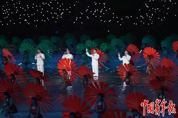 11月9日,广东广州,广东奥体核心体育场,第十五届全国活动会揭幕式上,歌手(左至左)林晓峰、陈小春、谢天华、钱嘉乐配合演绎典范歌曲。中青报·中青网记者 李隽辉/摄。